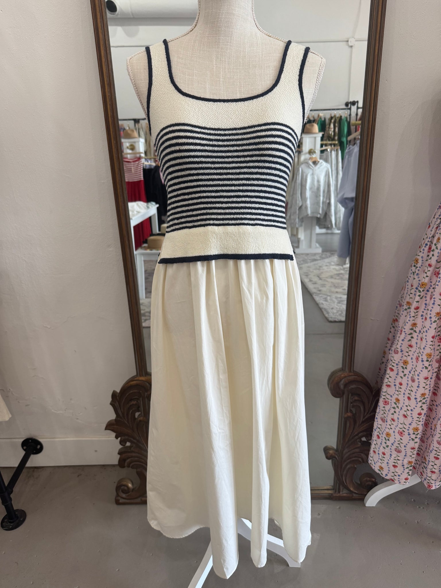 White & Navy Knitted striped top maxi dress with flowy skirt bottom