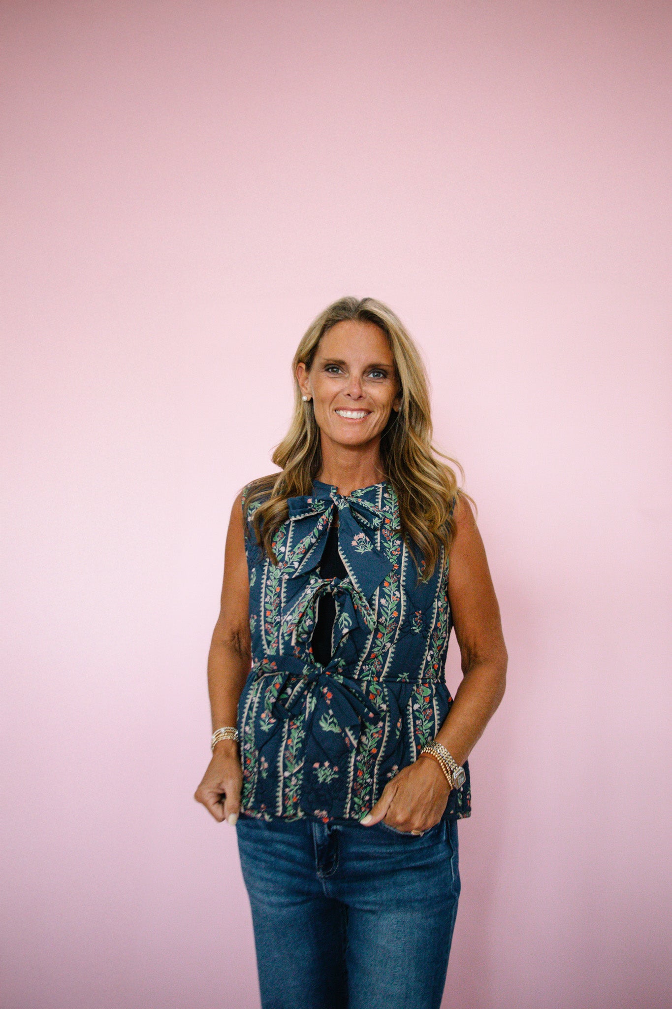 Elevate your layering game with this Navy Floral Tie Quilted Vest. Its soft quilted texture offers warmth without bulk, while the delicate floral pattern adds a touch of femininity. The unique tie closure down the front creates a flattering silhouette and easy adjustability, making it perfect for transitioning between seasons with style and comfort.