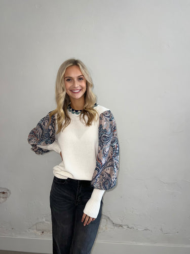 Cream Sweater with Blue Pattern Sleeves